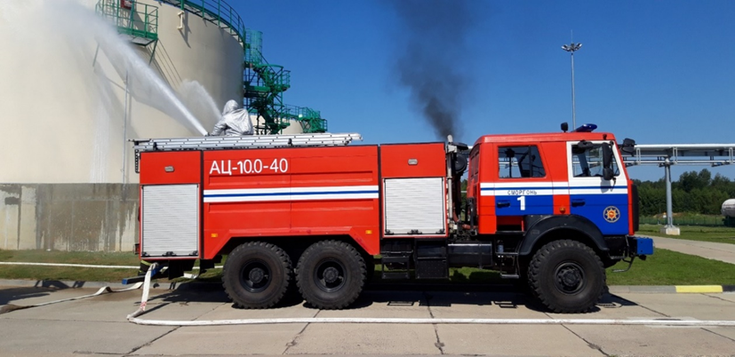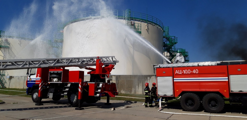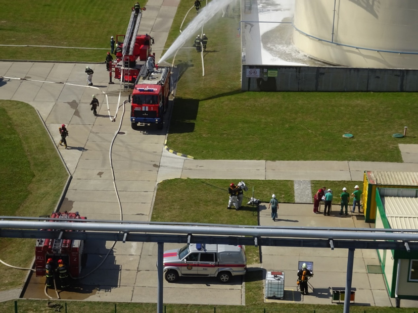 Одновременно от пожарных автоцистерн на тушение была проведена условная подача воздушно-механической пены в «горящий» резервуар через установленные на нём стационарные пеногенераторы. Для охлаждения резервуара использовался стационарный лафетный ствол пожарного автомобиля.