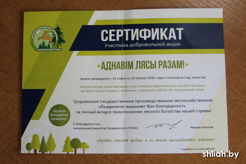 Каждый получил сертификат участника добровольной акции за личный вклад в приумножение лесного богатства нашей страны. При предъявлении его в лесхозе или лесничестве можно получить в подарок саженец.